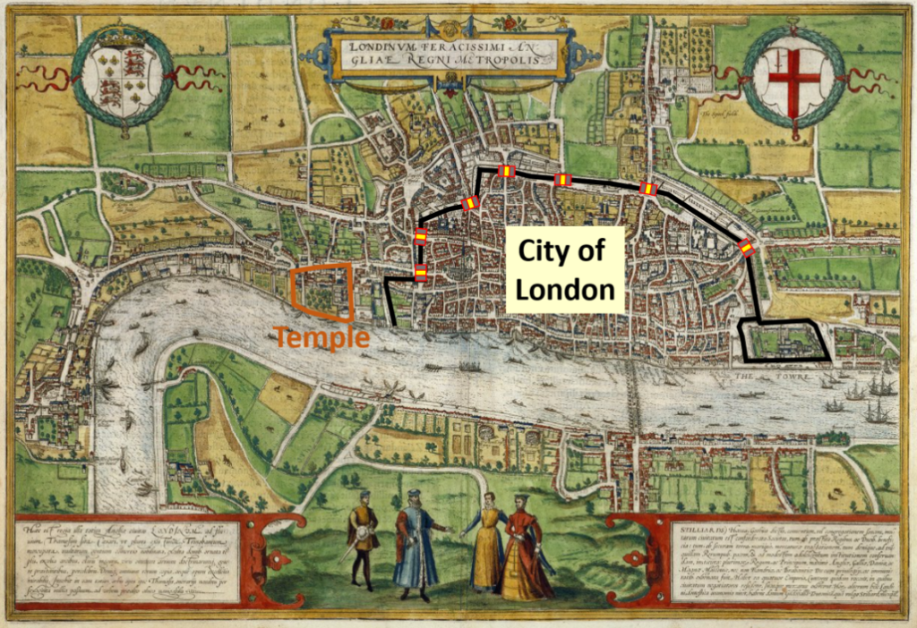 A map of 1572 London (in the middle of the reign of Queen Elizabeth I), with annotations added highlighting the roman city walls and gates to the city. Also highlighted is the location of “The Temple” (home of the inns of law).