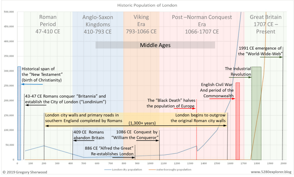 London was finally recovering, but it still shocks me to realize that after the withdrawal of the Romans, another 1,000 years would pass before London would achieve its early (modest) population levels again. In fact, it wasn’t until after the “Norman Conquest” of 1086 CE that the total population of England finally began to sustain the pattern of thriving growth I had originally expected to see.
